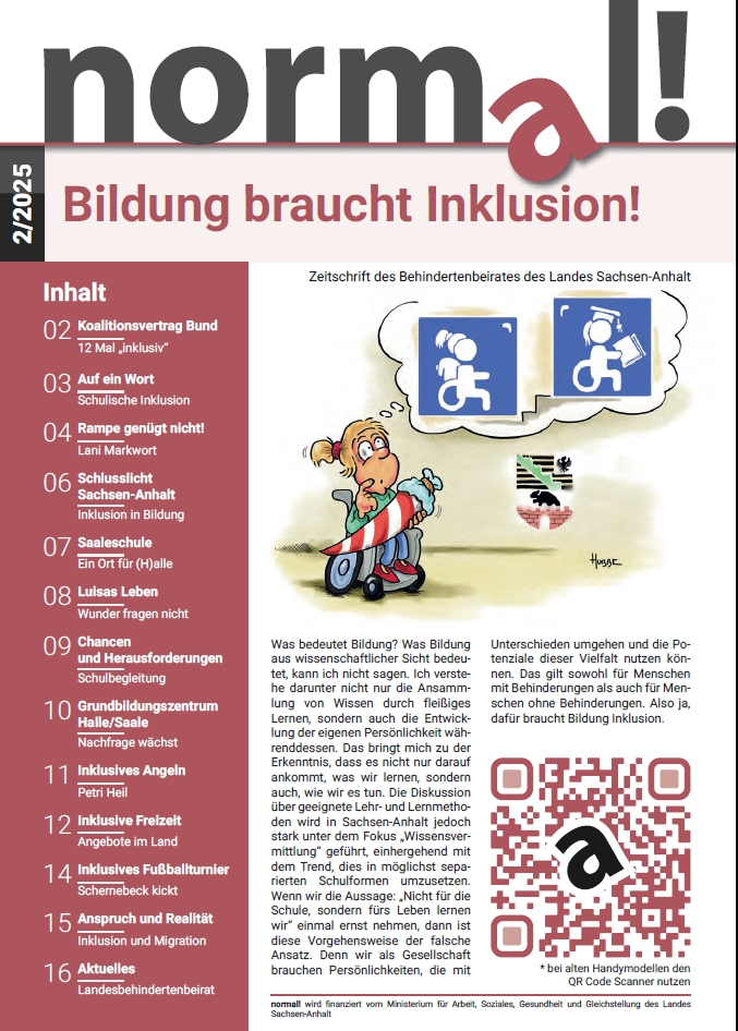 Die Zeitschrift des Behindertenbeirates Sachsen-Anhalt "normal!" ist nun auch in der Ausgabe 2/2025 "Thema: Dauerbrenner Barrierefreiheit" als Hörversion unter diesem Link zu erreichen.